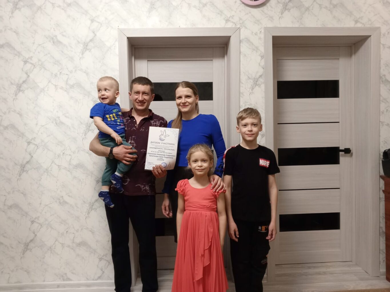 Еще в конце 2023 года молодая, дружная и активная семья Капитоновых приняла участие в первом региональном Фестивале-конкурсе любительских видеороликов «Многодетность – это счастье» в номинации «Я, ты, он, она – вот такая мы семья». К сожалению, Диплом участника они получили с «небольшим» опозданием, но это не беда! Награда всегда найдет своего героя!
