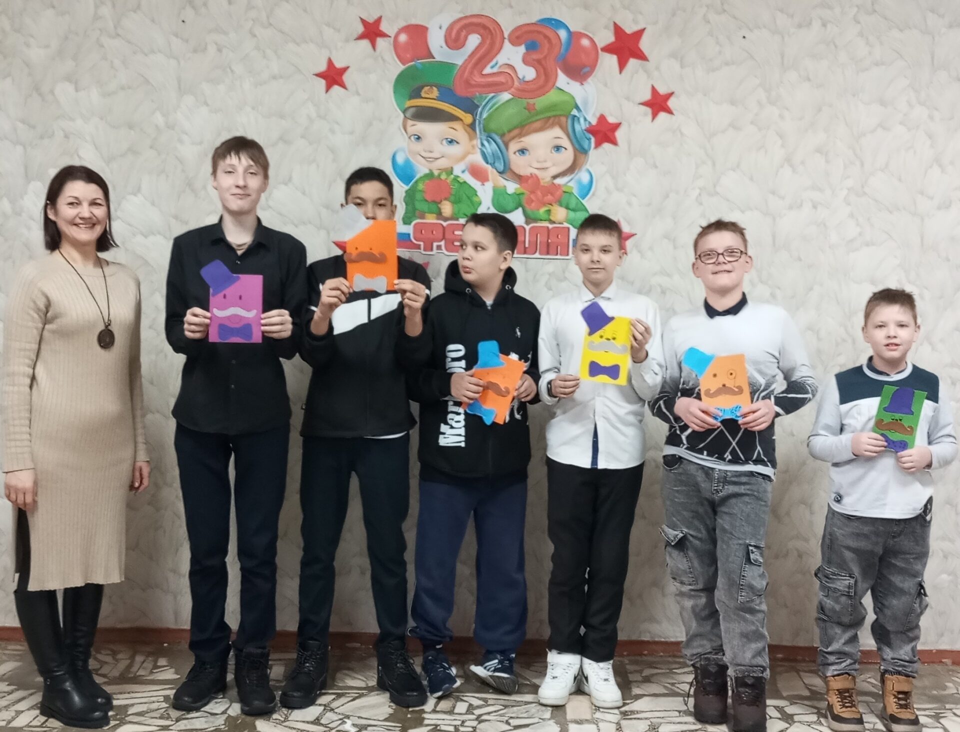 Затем, под руководством Александры Олеговны Брюхановой, педагога художественной школы, юные участники занялись творчеством. Во время мастер-класса «Для вас, защитники Отечества» изготовили праздничные открытки для пап, проявив при этом фантазию и творческий подход. Поэтому подарки получились яркими, наполненные теплыми пожеланиями и поздравлениями.