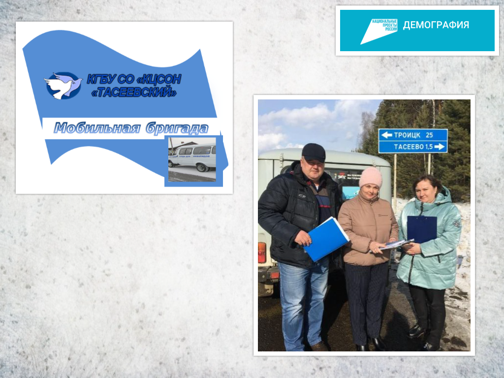 С целью доступности оказания социальных услуг и выявления граждан, нуждающихся в социальной помощи и поддержке, в отдаленных поселениях Тасеевского района еженедельно работает Мобильная бригада, состоящая из специалистов отделений КГБУ СО КЦСОН «Тасеевский». Мобильная бригада входит в структуру отделения срочного социального обслуживания. За ее организацию и выполнение мероприятий назнач...