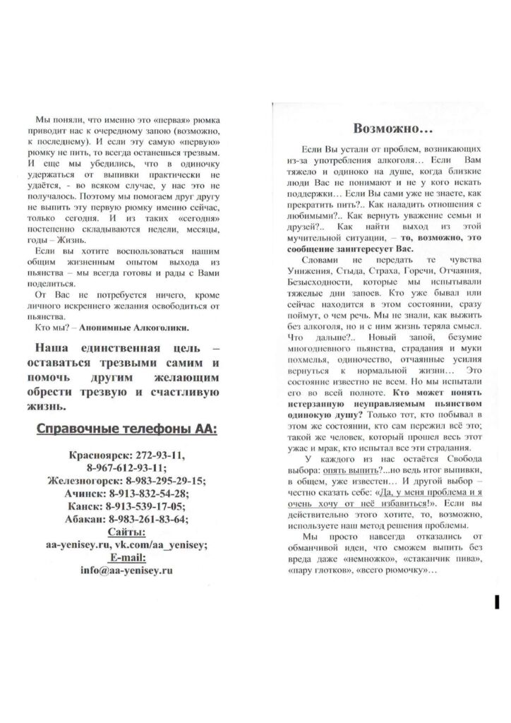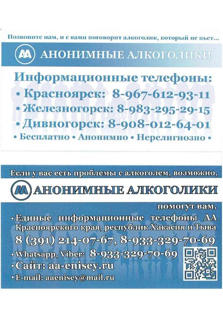 «Анонимные алкоголики Красноярского края и Республики Хакасия»  –  это содружество, объединяющее мужчин и женщин, которые делятся своим жизненным опытом, силами и надеждами помочь себе и другим избавиться от алкоголизма. Если Вы понимаете, что у Вас или у Ваших близких существует проблема под названием алкоголизм, Вы имеете возможность обратиться за помощью к людям, переживш...